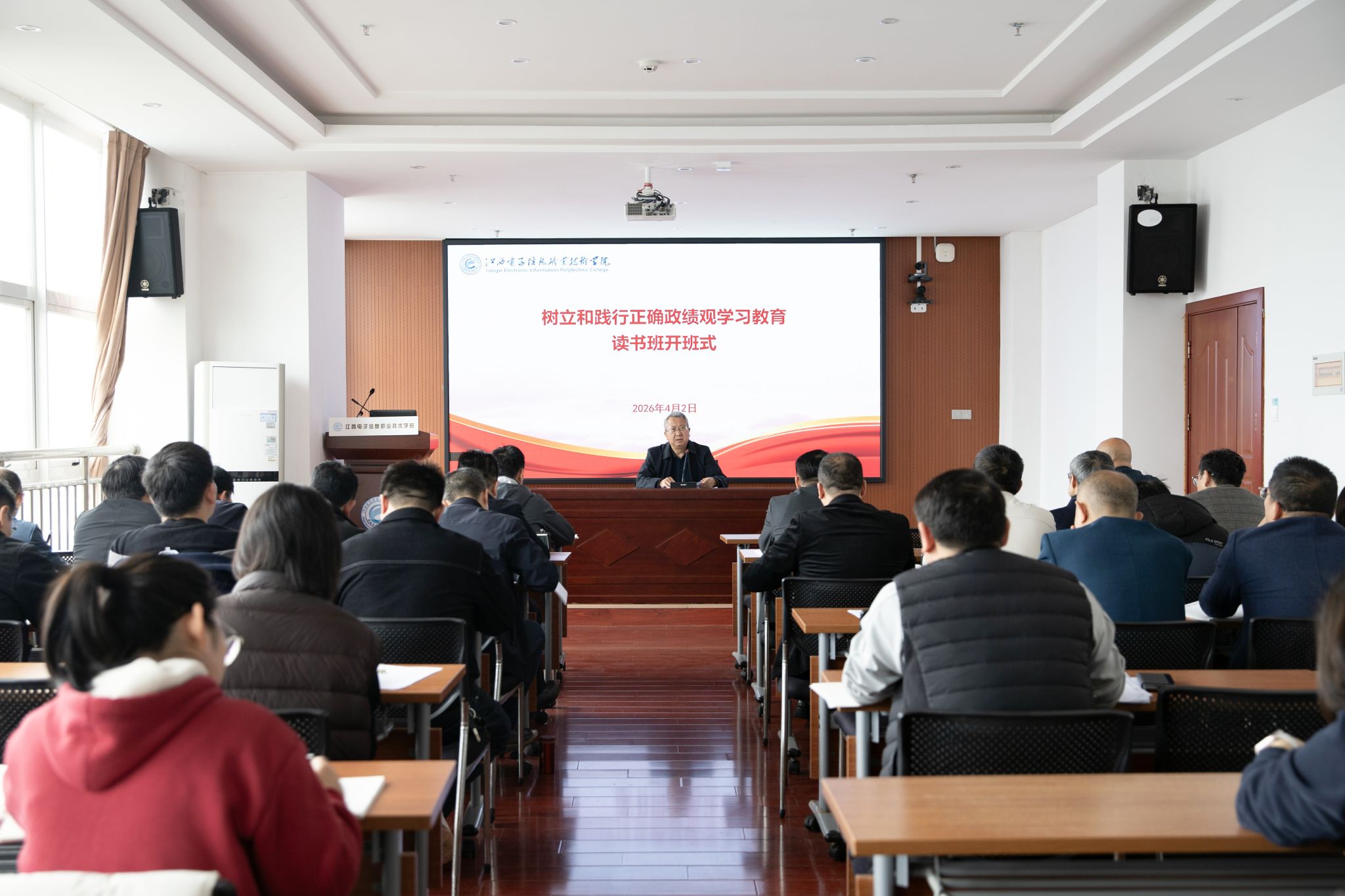 4月1日至4月3日,江西电子信息职业技术学院举办树立和践行正确政绩观学习教育读书班暨党委理论学习中心组学习(扩大)会议。校党委书记肖红秋作动员讲话和总结讲话,党委副书记、校长游振磊主持开班式。校党委班子成员、副处级干部、中层干部参加。