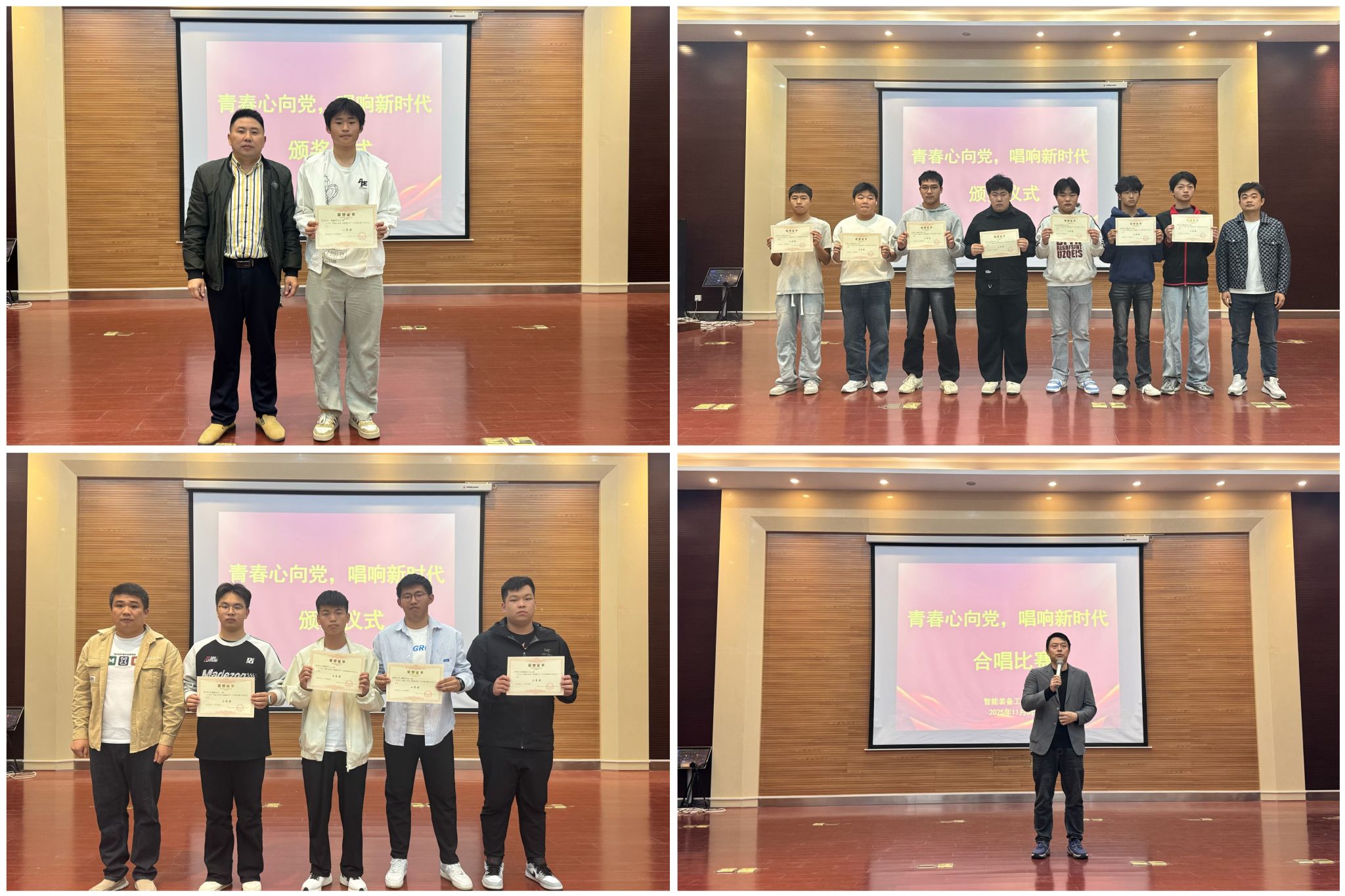 比赛中,来自两院的各参赛班级轮番登场,以嘹亮的歌声传递赤子之心,用激昂的旋律致敬峥嵘岁月。一首首动人歌曲,唱出了青年学子对祖国的无限热爱;一段段优美旋律,寄托了新时代大学生对未来的美好憧憬。评委们从演唱技巧、舞台表现、团结协作、整体感染力等多个维度对参赛班级进行综合评分。经过激烈角逐,最终信安250304、机器人高2544、制冷232、电气高2532等班级脱颖而出,荣获佳绩。